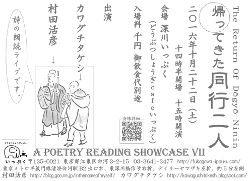 畏れ多くも自らを、芭蕉と曽良になぞらえて、男子ふたりの詩の道行き。深川⇒谷中⇒白山⇒渋谷⇒吉祥寺と西へ西へ。7年目の今年、出発の地深川へ帰って参りました。