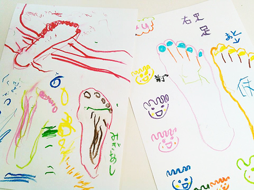 ・足をクレヨンで描いてみましょう!足のイラストで店内を飾ります。