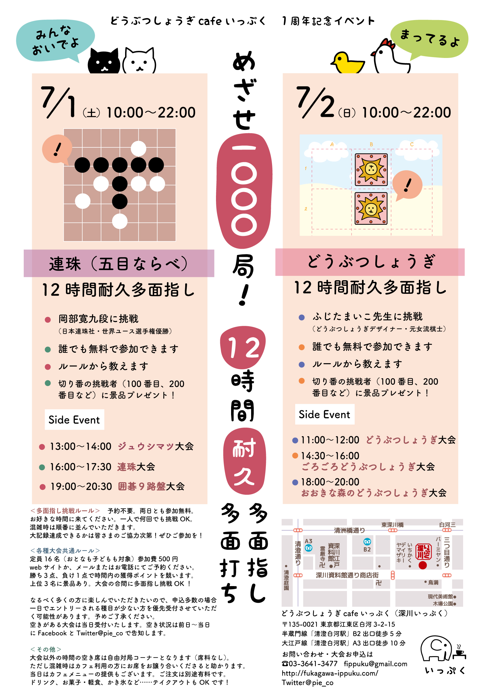 それを記念して、12時間耐久連珠多面打ち(7/1 10:00〜22:00)どうぶつしょうぎ多面指し(7/2 10:00〜22:00)と