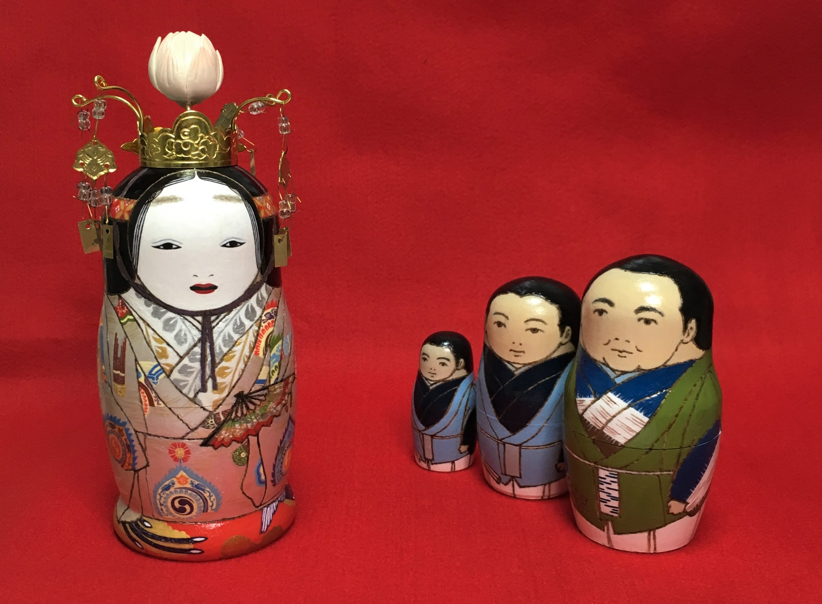 「能とマトリョーシカは相性がいいはずだ!(形状的に)」との思いつきから制作をはじめました。能面はしばしば「怖い」「無表情」などと言われたりしますが、それは能面だけをモノとして見ているせいだと私は考えています。能を観たことがある方はわかると思うのですが、能面は怖くない!ものすごく表情豊か!けっこうカワイイ!!